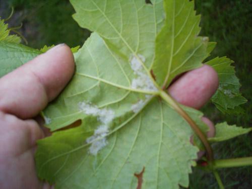 Милдью — опасное грибное заболевание, которое поражает все надземные органы винограда: листья, побеги, грозди. На листьях появляются светло-желтые просвечивающиеся маслянистые пятна округлой формы, чаще на зубцах листьев, куда стекают капли дождя или обильной росы. Если стоит теплая и влажная погода в течение нескольких дней, маслянистые пятна покрываются с нижней стороны белым пушистым налетом, который легко стирается пальцем. Это спороношения возбудителя заболевания. При сухой погоде грибного налета на листьях может и не быть. Пятна милдью быстро разрастаются, покрывают значительную часть пораженных листьев, которые буреют и засыхают. Наиболее восприимчивыми к болезни являются молодые листья. Взрослые листья летом менее восприимчивы к милдью, но осенью, с наступлением сырой погоды, они теряют свою относительную устойчивость и возле их основных жилок образуются новые многочисленные плодоношения гриба. При осеннем поражении маслянистые пятна ограничены жилками листа и окрашены в желто-зеленоватый цвет. На побегах признаки милдью встречаются реже, чем на листьях. Но если побеги поражаются, то верхняя молодая часть их высыхает и отмирает. Поврежденные побеги деформируются, теряют листья, куст ослабевает. На более старых побегах повреждения выражаются в появлении на узлах синеватых пятен и в образовании мелких продольных трещин, которые покрываются белым мучнистым налетом. Следы, оставляемые на побегах осенью, имеют вид черных продольных полосок. Грозди поражаются милдью еще до цветения. Заболевшие изгибаются, буреют, засыхают, бутоны осыпаются и погибают. При более позднем заражении растущие ягоды покрываются серым налетом. А в период налива и созревания милдью на ягодах образует вдавленные синеватые пятна. Ягоды буреют и погибают. Маслянистые пятна на листьях, белый мучнистый налет на их нижней стороне, повреждения на побегах, серая и бурая гниль на гроздьях — все это видимые признаки милдью. Зимует возбудитель заболевания в виде спор на пораженных опавших листьях и мицелием в пораженной лозе. Весной при температуре выше +12°С и наличии высокой влажности воздуха происходит заражение молодых листьев.