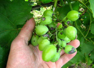 На зеленых побегах образуются бурые пятна, которые со временем увеличиваются и сливаются, вызывая образование вдавленных язв. Вдавленная часть серовато-фиолетового цвета, с черной каймой. Особенно опасна болезнь для соцветий. На гребнях, цветоножках и цветках образуются пятна с темным краем, цветки осыпаются. Молодые грозди могут поражаться антракнозом полностью. Они чернеют, засыхают и погибают. На созревающих ягодах образуются вдавленные бурые пятна с темно-пурпурной каймой, похожие на те, которые имеются на побегах. В результате заболевания ягоды растрескиваются. Для развития болезни благоприятно сочетание температуры +24...25°С и обильных осадков. При более высокой температуре развитие гриба приостанавливается. Зимует возбудитель антракноза в пораженных тканях винограда. Меры борьбы. Подбор устойчивых сортов. Опрыскивание кустов сразу после распускания почек бордоской смесью или ее заменителями. В дальнейшем те же способы борьбы, что и с милдью. Из грибных заболеваний виноград, ослабленный вредителями или механическими повреждениями, поражается различными гнилями. |