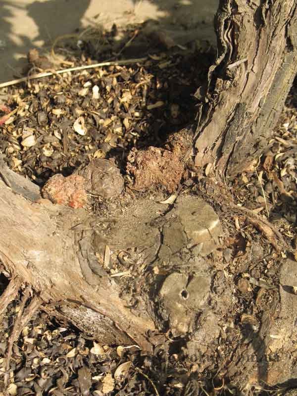 Рак виноградной лозы представляет собой нарост с узловатой поверхностью, образующийся в результате беспорядочного деления клеток. Чаще раковые опухоли развиваются на лозах, близко расположенных к земле, встречается и корневой рак. Возбудитель болезни — подвижная бактерия, живущая в почве, проникает в растение винограда через раны. С соком бактерии передвигаются по проводящей системе растения, заражая все органы. Сначала наросты мягкие, белого или бледно-розового цвета, впоследствии они темнеют, твердеют и приобретают губчатую структуру. Больные кусты чахнут, дают слабые побеги, так как движение сока у них затруднено, урожайность снижается. Особенно опасны опухоли в местах спайки на привитых виноградниках, где они вызывают отделение привоя от подвоя. Развитию заболевания способствуют слишком большие дозы азотных удобрений. В борьбе с бактериальным раком осенью при обрезке кустов необходимо полностью удалять больные лозы и опрыскивать виноград 1,5%-ным железным или медным купоросом. Заготавливать лозы для размножения только со здоровых растений. Выращивать привитые саженцы без контакта места спайки с землей. Старые кусты, пораженные болезнью, следует удалять и сжигать. При посадке выбраковывать саженцы с признаками корневого рака.