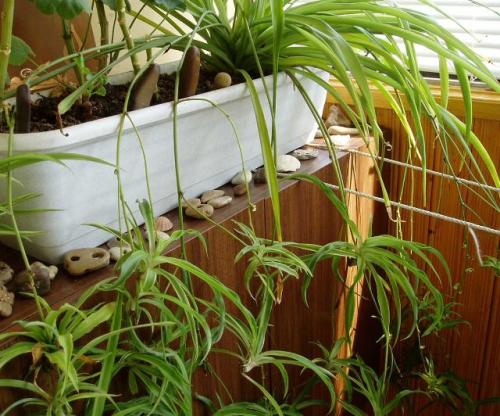 Название рода происходит от греческих слов «зеленый» и «растение». Существует около 215 видов многолетних корневищных растений, распространенных в субтропиках и тропиках Южной Америки, Африки, на острове Мадагаскар, в Южной Азии и Австралии. Хлорофитумы принадлежат к самым неприхотливым комнатным растениям. Хлорофитум капский. Родина — Южная Африка. Растет в лесах, тенистых местах, по берегам ручьев. Многолетнее розеточное растение с клубневидно утолщенными корнями. Листья длиной до 60 см, шириной 3 см, узколанцетные или линейные, постепенно суженные к основанию и к верхушке, желобчатые, с неострым килем с нижней стороны, светло-зеленые, голые. Цветоносы высотой до 20 см, выходят из пазух листьев, ветвящиеся, несут по всей длине несколько кистевидных соцветий из 2—6 зеленовато-белых мелких цветков. Плод — 3-гнездная коробочка. Хлорофитум хохлатый. Родина — влажные субтропики Южной Африки (провинция Натал). Сходен с предыдущим видом. Отличается от него менее длинными и более узкими листьями и наличием дочерних листовых розеток, развивающихся на распростертых, реже прямостоячих цветоносах. В культуре встречаются садовые формы с продольной белой полосой посередине. Для хлорофитума характерны свисающие усы, достигающие иногда 1 м, на концах которых вместе с белыми мелкими цветочками развиваются молодые растеньица. Потомство хлорофитума хохлатого за несколько лет может достичь значительных размеров. Особенно хорошо разводить их в висячих горшках. Местоположение: солнечное или тенистое, летом на свежем воздухе, растение хорошо переносит как тепло и сухой воздух от батарей, так и низкую температуру. Полив: довольно обильный, но, чтобы избежать загнивания мясистых корней, не следует допускать скопления воды в поддоне; если растение зимует в тепле, его надо время от времени опрыскивать. Земельная смесь: состоит из листовой, перегнойной земли, торфа и песка (2:1:1:1). Подкормка: с весны до осени еженедельно вносят удобрение для цветов. Размножение: отделением и посадкой молодых растений, вырастающих на концах усов. Примечание: из-за того что корни хлорофитума сильно разрастаются, растения нужно часто пересаживать, используя широкую посуду.