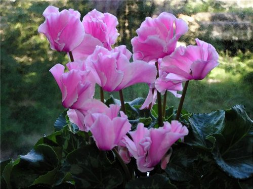Название рода происходит от греческого слова «круг» - по форме клубней у этих растений. Около 15 видов клубневых травянистых многолетников, распространенных в Центральной Европе, Средиземноморье до Ирана. Цикламен европейский. Родина — Центральная и Южная Европа. Вечнозеленое травянистое клубневое растение. Клубни около 10 см в диаметре, шаровидные или неправильной формы — удлиненные, вытянутые, уплощенные, с корнями, расположенными по всей поверхности, и подземными столонами, оканчивающимися дочерними клубнями. Сверху клубни несут укороченные побеги со сближенными в розетку листьями. Листья округло-сердцевидные, кожистые, темно-зеленые с серебристым рисунком, снизу темно-красные, около 2—4 см в диаметре. Цветки длиной около 2 см, розовые, с приятным запахом. Цветет с весны до осени. Цикламен персидский. Родина — Восточное Средиземноморье. Травянистое растение с уплощенным, шаровидным, сверху бугристым клубнем до 15 см в диаметре, с корнями, отходящими от нижней поверхности. Листья сердцевидные, до 14 см в диаметре, сверху с серебристо-серым рисунком, снизу — зеленые. Цветки длиной около 5 см, отогнутые назад, розовые до бледно-лиловых и белых с фиолетовыми пятнами в основании, очень ароматные. Цветет всю зиму до весны. Во время покоя сбрасывает листья. Культивируется с 1731 г. Со второй половины XIX века было выведено множество садовых форм, различающихся по величине и форме цветков и их окраске — от ярко-красной до почти черной, но с более слабым ароматом, чем у природного вида. Самая большая трудность — сохранить цветущие растения зимой, потому что они должны находиться в холодном месте, где мы можем ими любоваться только изредка. Местоположение: светлое, но не на солнце; в период цветения зимой содержат при температуре 12—15°С, но не ниже 10°С; после цветения за растением надо продолжать ухаживать: температуру поддерживают 16—18°С, листья не обрывают, во второй половине мая выносят в тенистое место в саду; не забывают подкармливать; перед первыми заморозками вносят в дом. Полив: почву поддерживают постоянно влажной и орошают растение мягкой водой комнатной температуры; поливают через поддон, чтобы вода не скапливалась в горшке, излишки воды через некоторое время сливают; таким же образом поступают с растением в период летнего покоя перед следующим цветением. Земельная смесь: состоит из листовой и перегнойной земли, торфа и песка (3:1:1:1). Подкормка: в периоды между цветением еженедельно подкармливают удобрением для цветов. Размножение: семенами, высееваемыми с сентября при температуре 18—20°С. Семена присыпают слоем земли толщиной 0,5—1,0 см (они прорастают в темноте); до появления всходов (через 25—40 дней) горшок прикрывают бумагой. Примечание: важно регулярно выскабливать — не вырезать! — отцветшие цветки и увядшие листья; клубень пересаживают 1 раз в год или в 2 года в свежую сыпучую почву, оставляя часть клубня на поверхности.