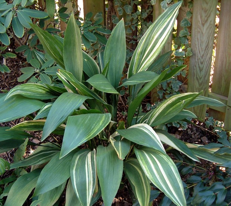 Название рода происходит от греческих слов «щит» и «звезда», что, вероятно, объясняется формой рыльца. Народное название аспидистры — «дружная семейка» связано с расположением листьев на корневище — «в тесноте, но не в обиде». Около 11 видов вечнозеленых травянистых корневищных многолетников, распространенных в Восточной Азии, лесах и горах Китая, Японии, Северного Вьетнама. Аспидистру высокую чаще всего выращивают цветоводы-любители. Это — малотребовательное растение, очень стойкое, растет при небольшом освещении, поэтому раньше его разводили в темных помещениях, например в мастерских. Вечнозеленые листья растения на коротких черешках, вырастающие прямо из корневища, достигают 80 см в длину и 50 см в ширину. В основании почти каждого такого листа находится 1—2 редуцированных чешуевидных листа, объемлющих черешок наподобие влагалища. Цветки невзрачные, появляются на корневище у поверхности почвы. Околоцветник ширококолокольчатый, с 8 долями, желто-бурый или малиново-бурый. К трубке околоцветника прикреплены 8 тычинок. Плод ягодообразный, односемянный. В культуре встречается форма с желтыми листьями с белыми полосками — она требует больше света, чем растения с зелеными листьями. Аспидистра так же, как сан- севиерия, растет практически в любых условиях. Местоположение: светлое, но защищенное от прямых лучей солнца, тенистое; зимой лучше выбирать прохладное место с температурой не ниже 5°С и не выше 16°С. Полив: почва должна быть постоянно влажной; зимой частота полива зависит от температуры окружающей среды. Земельная смесь: состоит из дерновой, перегнойной, листовой земли и песка, взятых в соотношении 1:2:1:1. Подкормка: с весны до осени вносят цветочное удобрение каждую неделю. Размножение: семенами и весной делением корневищ. Для этого вырезают куски корневища с 1—2 листьями и высаживают на укоренение в ящики или сразу в цветочный горшок. Температура почвы для укоренения не должна быть ниже 18°С. После укоренения растения пересаживают в горшки диаметром 8 см. Пересаживают растения редко, чтобы не травмировать корневище, не чаще, чем раз в 3 года. Примечание: избыток воды, солнечных лучей вызывает ожог листьев или гниение корней. Лекарственное значение: используют отвары из корней, стеблей, листьев. Их применяют при судорогах, желудочно-кишечных заболеваниях, аменорее (отсутствии менструации 6 месяцев и более), диарее (поносе), миалгии (болях в мышцах) и камнях в мочевыделительной системе.