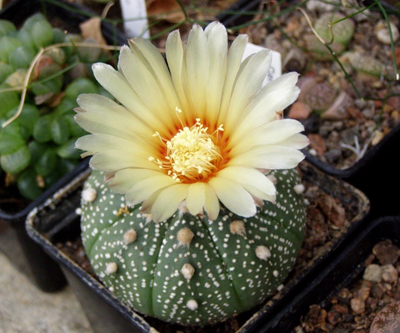 Название рода происходит от греческих слов «звезда» и «растение»: «звездчатый кактус». Известно 6 видов стеблевых суккулентных многолетников, произрастающих в США и Мексике. Характерная особенность большинства из них — белые крапинки на стебле, образованные миниатюрными волосками, способными всасывать влагу. Астрофитум крапчатый, или «звездчатый кактус». Родина — Мексика, растет в горных районах на известковых почвах. Стебель шаровидный, до 30 см в диаметре, испещрен белыми крапинками. Ребер чаще всего 5. Колючки отсутствуют. Цветки желтые, появляются на верхушке стебля по 1—3 одновременно. Астрофитум украшенный Родина — Южная Америка. Высота стебля до 1 м, диаметр 30 см. Ребер 8, колючек 5—11. Они прямые, шиловидные, сначала желто-коричневые, позднее коричневого цвета. Цветки кремоватые, слегка красноватые в середине. Кроме этих наиболее распространенных видов, существует еще несколько разновидностей и гибридов, которые также неприхотливы. Местоположение: очень солнечное, зимой держат при температуре 8—15°С, летом растения требуют тепла больше, чем зимой, необходимо хорошо проветривать комнату. Полив: весной и летом ограничен, зимой не поливают совсем. Земельная смесь: состоит из крупнозернистого песка, листовой земли, глинисто-дерновой земли, взятых в равных долях; кроме того, рекомендуется добавить немного древесного угля и извести. Подкормка: удобрения можно вносить в сухом виде, добавляя их в земельную смесь при посадке; ранней весной можно подкормить удобрениями для кактусов, концентрация должна быть половинной от той, которая указана на пакетике с удобрением. Размножение: семенами, стеблевыми черенками, прививкой. Все черенки необходимо 3—4 дня до посадки подсушить и только потом поместить в субстрат для укоренения. О других способах размножения можно прочитать в специальной литературе. Молодые растения, выращенные из семян, зацветают на 3-й год. Примечание: астрофитум пересаживают редко, только в тех случаях, когда корни опутывают весь земляной ком.