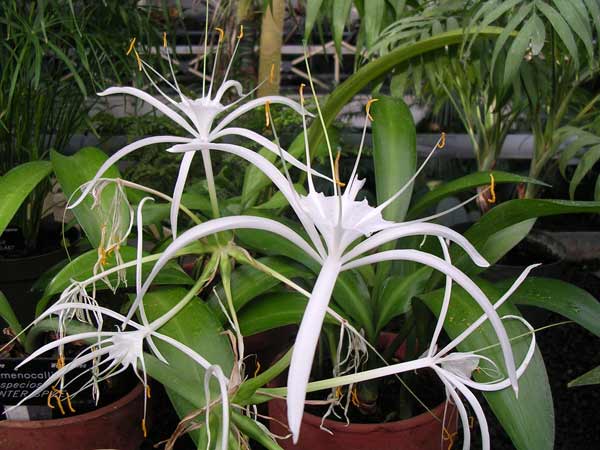 Название рода происходит от греческих слов «пленка» и «красота», тычинки соединены между собой мембраной, образующей как бы второй венчик. Известно 56 видов луковичных растений, распространенных в субтропиках и тропиках Южной Америки. Они растут в долинах и по берегам рек, в предгорьях и горах. Большинство из них — многолетники с луковицеобразно утолщенным стеблем. Листья сидячие или на коротких черешках. Цветки белые или желтоватые, душистые, в многоцветковых зонтиках. Самые красивые виды этого рода культивируются издавна. Особого внимания заслуживает гименокал- лис карибский, который чаще всего разводят любители. Родина — Антильские острова, растет по морским побережьям. Растение с округлой подземной луковицей до 10 см в диаметре. Листья длиной до 90 см, шириной 7 см, узколанцетные или почти ремневидные, острые, слегка сужающиеся к основанию. Цветки крупные, белые, душистые, собраны по 6—12 в зонтиковидном соцветии на безлистном уплощенном цветоносе, который короче листьев. Тычиночные нити соединены между собой до половины длины перепончатой мембраной наподобие коронки нарцисса. Пыльники буровато-оранжевые. Цветет зимой. Культивируется с 1872 г. Местоположение: от светлого до солнечного; отцветший гименокаллис нарциссовый можно вынести в сад, а осенью вновь забрать в помещение; его луковицы содержат зимой в сухом и прохладном месте при температуре около 10°С, а в марте высаживают в новую землю и выгоняют при более высокой температуре; гименокаллис прекрасный даже зимой нуждается в температуре 20°С. Полив: летом почва должна быть постоянно влажной, зимой также не пересыхать. Земельная смесь: состоит из дерновой, перегнойной и листовой земли, взятых в соотношении 1:2:2 с добавлением песка. Подкормка: в период роста еженедельно вносят цветочное удобрение; гименокаллис нуждается в подкормке даже зимой. Размножение: размножают весной дочерними луковицами. Молодые растения зацветают через 3—4 года. Примечание: гименокаллис лучше растет на окнах, выходящих на запад и восток.