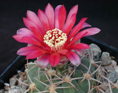 Название рода происходит от греческих слов «голый» и «чашечка», отсюда русское название — голочашечник. Число видов колеблется от 50 до 70. Эти стеблевые суккуленты распространены в Аргентине, Бразилии, Боливии, Уругвае и Парагвае. Гимнокалициум горбатый. Родина — Южная Аргентина. Стебель шаровидный, позднее цилиндрический, высотой до 20 см и 10 см в диаметре. Ребер 12—19 с бугорками. Радиальных колючек 7—10, они светло-коричневые, центральных 1—2 (или они отсутствуют). Цветки белые или розовые длиной до 6,5 см. Гимнокалициум Сальона. Родина — Аргентина. Стебель до 30 см в диаметре. Радиальных колючек 8— 15, длиной около 4 см, центральная — 1 (иногда более). Все колючки коричневые или черные. Цветки белые или розовые, длиной до 3,5 см. В Европе известны две разновидности: Миханович и Фридрих. Для этих ярко-красных либо желтых кактусов подвоем служит гилоцереус. Они были выведены в Японии в 1941 и 1970 гг. Поскольку эти кактусы не содержат хлорофилла, они не могут развиваться самостоятельно и их прививают на зеленые кактусы. Гибриды поражают крупными цветками всевозможной окраски, за исключением голубой. Местоположение: светлое, но не под прямыми солнечными лучами, слегка притененное, зимой поддерживают температуру 10—15°С. Полив: летом — умеренный, зимой кактусы не поливают или поливают раз в 2 недели. Земельная смесь: состоит из крупнозернистого песка, листовой и глинисто-дерновой земли, взятых в равных количествах. Желательно в эту смесь добавить немного древесного угля и извести. Подкормка: летом ежемесячно вносят цветочное удобрение. Размножение: отростками (если они есть) или семенами. Примечание: для гимнокалициума, привитого на гилоцереусе, температура должна быть выше — по крайней мере 18°С. Нуждается в обильном поливе.