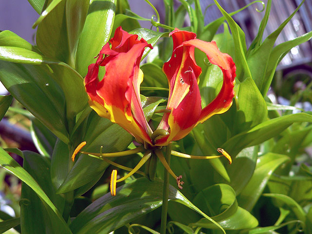 Название рода происходит от латинского «славный», «прославленный». В тропиках Африки и Азии распространены 5 видов лиановидных клубневых растений. В комнатах разводят 2 вида. Глориоза роскошная. Родина — Южная Азия и Африка, растет во влажных субтропических и тропических лесах. Многолетняя травянистая лиана с клубнем в основании стебля. Разветвленные побеги длиной до 2 м цепляются за опору усиковидными окончаниями листьев. Листья сидячие, очередные, иногда супротивные или в мутовках по 3, узкояйцевидноланцетные, с тонкой, спиралевидно закрученной наподобие усика верхушкой; цветки расположены поодиночке в пазухах листьев. Околоцветник раздельный до основания, листочки его отогнуты к цветоножке, с нижней стороны розоватые, сверху оранжево-красные, с крупным желтым пятном в основании, верхняя часть ярко-красная, по краю очень курчавые. Тычинки радиально расставленные, напоминают спицы колеса. Цветет в июле—сентябре. Глориоза Ротшильда. Родина — тропические леса Восточной Африки. Ее оригинальные красные цветки с желтой кромкой достигают 12 см в диаметре. Вьющиеся побеги этого растения нуждаются в подпорках. Края листочков околоцветника около 10 см длиной, лишь слегка волокнистые. Известна садовая форма с цветками, испещренными желтым и винно-красным узором. Цветет с июня по август. Глориоза легко переносит зиму благодаря клубням. Однако комнатная культура требует большого внимания. Местоположение: светлое, теплое и солнечное; летом растение рекомендуется вынести на свежий воздух и подвязать побеги к подпоркам. После того как поздним летом засохнут листья, клубень следует оставить в горшке и содержать всю зиму без полива при температуре 12—15°С; в феврале можно очистить клубень, осторожно пересадить в цветочную землю; выгонка должна происходить при температуре около 20°С. Полив: летом — нормальный; с осени полив следует уменьшить, а после засыхания листьев — полностью прекратить; весной, когда растение выпускает новые побеги, его рекомендуется часто опрыскивать для повышения влажности воздуха. Земельная смесь: состоит из равных частей дерновой земли, листовой земли, торфа, перегноя и песка. Подкормка: в период роста растения подкармливают несколько раз органическими и минеральными удобрениями (4 раза в месяц). Размножение: молодыми клубнями, которые отделяют от материнских при пересадке, а также семенами; семена высевают в январе—феврале в легкую рыхлую землю, они сохраняют всхожесть до 3 лет; сеянцы зацветают на 2-3-й год. Примечание: обращаться с глориозой следует осторожно, так как ее корневища и наземная часть ядовиты! Не забудьте вовремя поставить опору (палочку, сетку, решетку) для вашего растения, с помощью которого можно задекорировать стену или ненужное окно. При пересадке не повредите почку клубня — «детку», иначе не получится нормальный росток — новый побег.