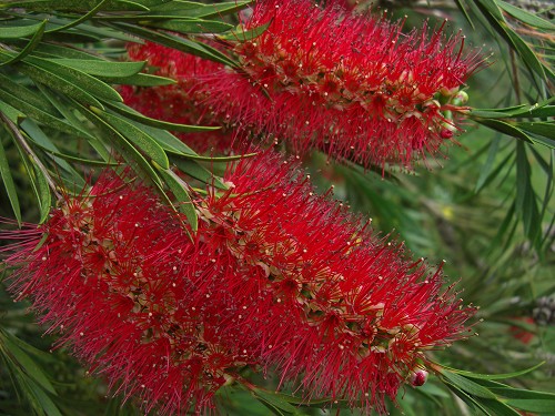 Название происходит от греческих слов «красивый» и «тычинка». Яркие длинные тычинки создают основной эффект во время цветения. Около 25 видов небольших вечнозеленых деревьев или кустарников. Каллистемоны произрастают в Австралии, Тасмании и Новой Каледонии, большей частью на влажных песчаных почвах, по берегам рек, нередко на каменистых сухих склонах. В комнатной горшечной культуре встречаются нечасто, хотя их выращивание не представляет большого труда. Цветоводы-любители чаще всего выращивают каллистемоны иволистный, красивый, лимонный. Каллистемон иволистный. Родина — Новый Южный Уэльс, Южная Австралия; растет по берегам рек. Кустарник или небольшое дерево с серовато-зелеными листьями. Цветки собраны в плотные цилиндрические колосья. Основную часть цветка составляют многочисленные длинные торчащие тычинки, из-за которых колосья становятся похожими на бутылочные «ершики». В зависимости от окраски тычинок они бывают ярко-красные, реже желтые или кремовые. Ось колоса после окончания цветения продолжает расти как обычный вегетативный побег, на котором год спустя, снова появляются соцветия. Плоды — деревянистые коробочки, шаровидные или яйцевидные — плотно облепляют веточки и долго не раскрываются, оставаясь на них 2 года и более. Каллистемон красивый. Родина — Западная Австралия. Кустарник или невысокое дерево с ребристыми побегами, с листьями до 10 см длиной. Цветочные колосья очень густые, одни из самых крупных в роде — длиной 7—12 см (до 15 см), шириной 5—6 см, очень декоративны благодаря интенсивно-красным тычиночным нитям, оканчивающимся ярко-желтыми пыльниками. Тычинки длиной 2—3 см. Один из самых красивых в этом роде. Каллистемон лимонный. Родина — Юго-Восточная Австралия. Кустарник высотой до 3 м (редко выше) с прямостоячими или распростертыми ветвями, молодые экземпляры шелковистоопушенные. Листья линейные, ланцетные или обратноланцетные, на верхушке острые; иногда с ос- троконечием, длиной 5,5—8,5 см, шириной 6 мм и более, жесткие, с выступающими средней и боковыми жилками и многочисленными точечными железками, которым растение обязано тонким лимонным ароматом. Цветочные колосья довольно рыхлые, длиной 9—10 см, 6—7,5 см в диаметре, темно-шарлахово-красные. Тычинки длиной 3 см, в числе 50—60, располагаются в 2 круга. Пыльники одного цвета с тычиночными нитями, но более темные. Самый популярный в культуре вид рода, который цветет в раннем возрасте. Каллистемон лимонный может расти в комнатных условиях, но в больших деревянных ящиках; летом его необходимо выставлять наружу. Молодое растение выпускает 10-сантиметровые соцветия, напоминающие «ерш» для мытья бутылок. Местоположение: с середины мая лучше всего на открытом воздухе на солнечном месте; зимой в светлом и холодном помещении при температуре 6—10°С, не выше; растение переносит сухой воздух. Полив: летом почва должна быть постоянно слегка влажной; поливать только мягкой водой; зимой поливают очень мало. Земельная смесь: состоит из дерновой, листовой и перегнойной земли, взятых в равных частях, с добавлением песка (0,5 части), реакция почвы должна быть слабокислой. Подкормка: с весны до позднего лета каждые 2 недели вносят удобрение для цветов. Размножение: летом верхушечными черенками, за исключением каллистемона лимонного. Сеянцы его растут медленно и долго, прежде чем 