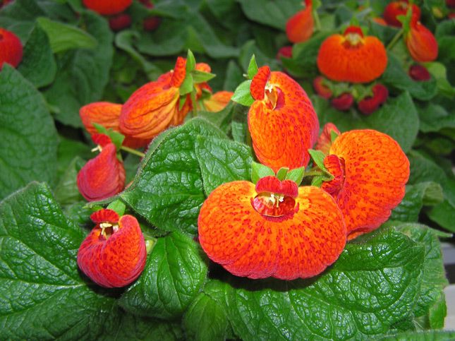 Название рода происходит от латинского «цветок, похожий на башмачок». Известно около 500 видов травянистых растений и кустарников, распространенных преимущественно в Андах, Перу и Чили, а также в Мексике и Новой Зеландии. В комнатах выращивают 2 вида. Кальцеолярия городчатоцветковая. Родина — Чили. Травянистое растение высотой до 60 см. Прикорневые листья на длинных черешках, волнистые, опушенные. Стеблевые листья короткочерешковые, верхние — сидячие. Цветки желтые с красновато-коричневыми точками. Верхняя губа двугубого венчика образована двумя лопастями. Цветок по форме похож на туфельку. Кальцеолярия пурпурная. Родина — Чили. Травянистое растение высотой до 60 см. Прикорневые листья лопатчатые, по краю зубчатые, заостренные. Цветки мелкие, пурпурные или с красноватым оттенком. Нижняя губа продолговатая, бороздчатая. В культуре встречаются кальцеолярии с желтыми, золотистыми, оранжевыми «башмачками», чаще всего это гибриды или сорта. Местоположение: светлое, но не солнечное, по возможности прохладное и проветриваемое, например на подоконнике окна, выходящего на север. Полив: всегда обильный, но, если растение стоит в затененном холодном месте, не допускают скапливания воды в поддоне. Земельная смесь: состоит из равных частей компоста и дерновой земли с добавлением песка и торфа. Подкормка: еженедельно вносят цветочное удобрение в жидком виде. Размножение: черенками неодревесневшими, либо семенами с двойной пикировкой сеянцев. Примечание: массовое цветение кальцеолярий приходится на весну. Обрезку и пересадку рекомендуется проводить после цветения.