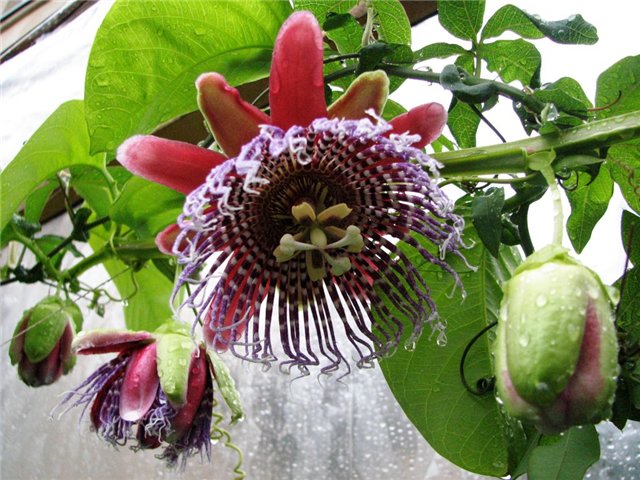 Название рода происходит от латинских слов «переживание» («претерпевание») и «цветок»; (русское название растения — страстоцвет). Дано миссионерами в Южной Америке, увидевшими в отдельных частях цветка «орудия страстей господних». Более 500 видов лиан, распространенных преимущественно в Америке, а также в Азии, Австралии и на острове Мадагаскар, на островах Полинезии. Пассифлора голубая. Родина — Южная Бразилия, Парагвай, Аргентина. Лазающая лиана с одревесневающими стеблями, цепляющимися за опору с помощью усиков. Листья до 20 см в диаметре, очередные, пальчато-рассеченные на 5—7 продолговато-ланцетных сегментов, цельнокрайние, слегка сизоватые, у места прикрепления черешка с двумя железками. Усики простые, неразветвленные, располагаются в пазухах листьев. Цветки белые или розовые, одиночные пазушные, с легким запахом, до 10 см в диаметре. Между околоцветником и тычинками находится особое образование — корона из многочисленных, слегка волнистых яркоокрашенных в голубой или синий цвет, в основании пурпурных нитей. Плод — желтовато-оранже- вая яйцевидная ягода длиной до 6 см. Культивируется с XVI века. Пассифлора трехполосная. Родина — Перу. В отличие от предыдущего вида имеет ребристый стебель, 3-лопастные листья, оливково-зеленые с более светлыми или серовато-пурпурными полосами вдоль главных жилок, снизу — фиолетово-пурпурные, более мелкие (до 4 см в диаметре) зеленоватые или желтовато-белые цветки и округлые сизоватые плоды до 2,5 см в диаметре. Культивируется с 1868 г. Эти виды и их гибриды можно выращивать в комнате, другие — только в оранжерее. Пассифлоры — лианы, поэтому им нужны подпорки. Местоположение: светлое, солнечное, продуваемое, летом рекомендуется выносить растение на воздух; зимой температура должна быть примерно 10°С. Полив: летом — обильный, чтобы почва постоянно была влажной, зимой — ограниченный, избегать пересыхания земляного кома; рекомендуется опрыскивание, особенно молодых растений. Земельная смесь: состоит из листовой, перегнойной земли, торфа и песка, взятых в соотношении 1:2:2:1. Подкормка: в период активного роста растения используют много питательных веществ, рекомендуется подкормка минеральными и органическими удобрениями, которые вносят летом ежемесячно. Размножение: весной и летом верхушечными черенками (укоренение через месяц) или корневыми отпрысками в песке; семена можно высевать в феврале—марте в плошки и почвенную смесь из равных частей листовой, торфяной, перегнойной земли и песка; температура для прорастания семян должна быть не менее 20—24°С; при этом необходима достаточная влажность воздуха и почвы. Примечание: во время пересадки весной растение сильно обрезают, чтобы стимулировать его рост; развивающиеся побеги будут обильно цвести. Лекарственное значение: жидкий экстракт из листьев и стеблей, взятых в соотношении 1:2, используют как седативное средство при неврастении, хроническом алкоголизме, бессоннице, климактерических нарушениях. Дневная доза составляет 2—5 г жидкого экстракта или 20—40 г сухого растения в виде отвара.