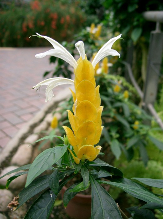 Название рода происходит от греческих слов «толстый» и «колос». Известно 12 видов кустарников и многолетних травянистых растений, распространенных в тропиках Америки. Пахистахис желтый. Родина — Мексика и Перу. Вечнозеленый кустарник высотой около 1 м, с тонкими побегами. Листья супротивные, длиной до 12 см, овальные, заостренные, с четким жилкованием. Соцветие колосовидное, длиной до 10 см, прямостоячее, располагается на конце побега. Цветки белые, длиной до 5 см, быстро опадают. Венчик двугубый. Декоративный вид растению придают долго не опадающие яркие оранжевожелтые прицветники. Культивируется с конца XIX века. В комнатном цветоводстве его начали разводить уже в начале прошлого столетия, в настоящее время он вновь завоевал былую популярность. Несмотря на то, что пахистахис цветет с весны до осени, он теряет свою декоративность, поэтому не стоит разводить его в течение продолжительного времени. Местоположение: круглый год светлое и солнечное, но не под прямыми лучами солнца; зимой температура воздуха и почвы не должна опускаться ниже 18°С. Полив: рекомендуется поддерживать почву во влажном состоянии, а зимой часто опрыскивать растение, обеспечивая таким образом требуемый уровень влажности воздуха. Земельная смесь: состоит из перегнойной, листовой земли, торфа и песка в соотношении: 2:1:2:1. Подкормка: с весны до осени каждые 2 недели вносят цветочное удобрение. Размножение: весной верхушечными черенками. Примечание: весной при пересадке пахистахис можно слегка обрезать или прищипывать верхушку и боковые побеги, придав ему более декоративную форму. При размножении рекомендуется высаживать по 2—3 укороченных черенка в один горшок.