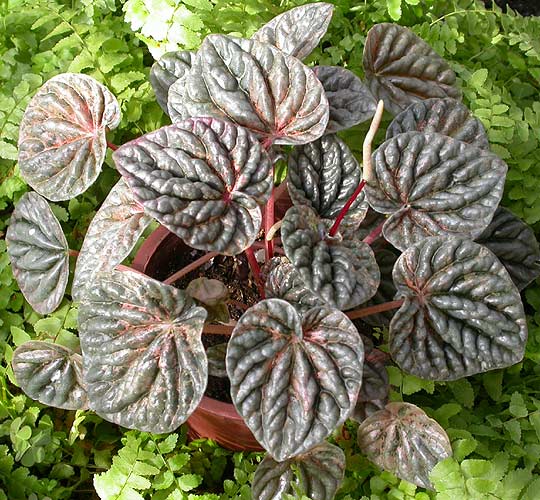 Название рода происходит от греческих слов, означающих «перец» и «подобный» («одинаковый»), т.е. указывает на сходство с перцем. Обширный род, охватывающий около 1000 видов многолетних, реже однолетних трав или полукустарников часто слегка суккулентного облика. Распространены в тропиках и субтропиках обоих полушарий, однако большинство видов происходит из тропических районов Америки (от Флориды и Мексики до Чили и Аргентины), где они растут в тенистых местах под пологом леса наземно — на рыхлых торфянистых почвах или на деревьях, гниющих стволах либо на скалах и каменистых россыпях. Ценят пеперомии за красивые, часто блестящие, иногда бархатисто-опушенные, ярко окрашенные листья. В комнатах выращивают 5—7 видов, из них наиболее популярны 3 вида: пеперомия серо-серебристая, сморщенная, бархатистая. Они великолепно выглядят с зелеными, пестрыми или сморщенными листьями с оригинальными колосовидными соцветиями. Пеперомия бархатистая. Родина — Эквадор. Травянистое растение с прямостоячими темно-красными, мягкоопушенными стеблями. Листья очередные, короткочерешковые (длина черешка 7—10 мм), от яйцевидно-ланцетных до почти округлых, длиной 4—б см, шириной 3—4,5 см, сверху темно-бархатисто-зеленые, снизу ярко-пурпурные, с 5—7 светло-зелеными или серебристыми жилками, голые или слегка волосистые в основании, иногда бархатисто-опушенные по всей поверхности. Колосья верхушечные или пазушные, длиной около 7 см, шириной 3 мм. Пеперомия серо-серебристая. Родина — Бразилия. Растение с сильно укороченным ветвистым стеблем, несущим многочисленные розетки листьев. Листья с длинными бледными черешками, значительно превышающими длину пластинки, округло-яйцевидные, на верхушке тупозаостренные, в основании сеодцевидные или щитовидные, длиной 4—6 см, шириной около 4 см, серосеребристые или серебристо-зеленые с металлическим блеском, с 5—7 вдавленными дуговидными жилками, придающими волнистый характер поверхности. В культуре хорошо известна также садовая форма с более темными, почти черно-зелеными, на просвет темнобурыми листьями. Пеперомия сморщенная. Родина — Бразилия. Растение, сходное по форме с предыдущим, но еще более мелкое, компактное, высотой не более 10 см. Листья сближенные наподобие розеток, длиной 2—3,5 см, шириной 1,5—3 см, яйцевидные, глубокоскладчатоморщинистые или пузырчатые с погруженными сверху и резко выделяющимися снизу жилками, темно-зеленые с шоколадно-коричневым оттенком по дну бороздок, снизу серовато-зеленые. Листовые черешки длинные, бледно-розовые, слегка ребристые, прикрепляются к пластинке на расстоянии 5 мм от края. Многочисленные снежно-белые тонкие колосья длиной до 7 см эффектно контрастируют с темными листьями. Пеперомия сморщенная — один из немногих красиво цветущих видов рода. Местоположение: от светлого до полутенистого; зимой температура воздуха и почвы должна быть выше 18°С; растения нельзя выносить на свежий воздух; виды с толстыми листьями более стойкие, чем с тонкими. Растения с зелеными листьями летом нуждаются в сильном притенении, пестролистные же формы требуют более яркого освещения. Полив: всегда ограниченный, а зимой в еще большей степени; однако высокая влажность воздуха благоприятно влияет на растения; для полива и опрыскивания (особенно это касается растений с гладкими блестящими листьями) 