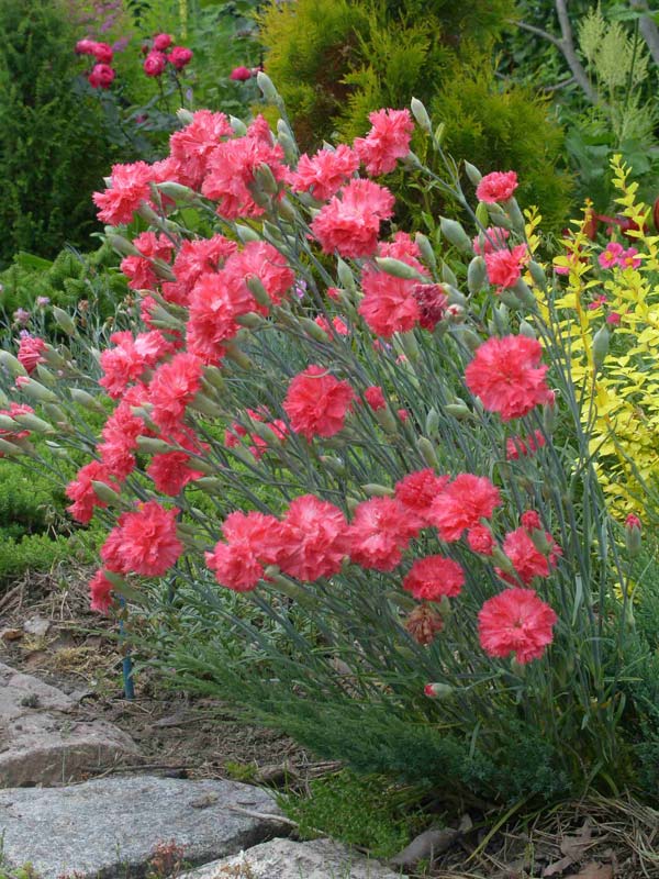 Многолетнее прямостоячее раскидистое растение высотой 20—70 см, с травянистыми или полуодревесневшими побегами, заканчивающимися 3—13 крупными душистыми цветками. Цветки махровые, полумахровые и немахровые с цельным, зубчатым или рассеченным краем. Цветет с июля до морозов. Плод — цилиндрическая, заостренная на конце многосемянная коробочка. Семена черные, в 1 г 500—600 штук, всхожесть сохраняют 2—3 года. Светолюбивое, теплолюбивое растение с замедленным развитием (4—6 месяцев от посева до цветения). Зимует в открытом грунте только в южных районах страны. Переносит заморозки до минус 2—3°С. Предпочитает плодородные, водопроницаемые, хорошо известкованные почвы. Не выносит свежего навоза и переувлажнения. Размножают семенами и черенками. Высевают семена в феврале для того, чтобы получить цветение в июле. Дают две пикировки и высаживают на постоянное место в мае на расстоянии 20—25 см друг от друга. Маточники для черенкования сохраняют в прохладном помещении. Черенкуют в феврале—марте. Вырастить рассаду в домашних условиях без оранжерейной площади сложно, поэтому ее чаще приобретают в магазине. Уход обычный. Гвоздика Шабо ценится за свои Душистые, крупные цветки ярких окрасок, эффектно выглядит на близком расстоянии, широко используется для балконного озеленения, низкие сорта высаживают в горшки. Имеются многочисленные сорта гвоздики Шабо, различающиеся по высоте растения, окраске цветков; в последнее время выведена группа ремонтантно-цветущих, имеются сорта: Мари Шабо — желтые, Жанна Дионис — белые, Фейеркинг — красные, Роза — розовые и др. Гвоздика садовая поражается трипсами, совками, клещом.