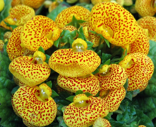 Из-за формы цветов носит также название башмачки. Родина — Южная Америка. Многолетнее горшечное растение для временного содержания в помещении. Куст хорошо облиственный, высотой около 30 см с желтыми, оранжевыми, оранжево-красными, красными, двуцветными, оригинальными по форме двугубыми цветками, собранными в кистях на концах побегов. Цветет очень обильно с мая до июля. Растение светолюбивое, но хорошо переносит полутень, очень требовательно к почве; при выращивании необходимы полив и частые подкормки коровяком или полным минеральным удобрением. Размножают семенами и черенками. Выращивание из семян занимает 6—7 месяцев, дают 1 пикировку сеянцев и 3 перевалки в горшки. Земля листовая, торфяная, для последней перевалки добавляют сухой коровий навоз или птичий помет. При посеве в июне — августе цветение наступает в апреле. В домашних условиях растение можно сохранять многие годы и размножать черенками, которые нарезают в середине лета, высаживают в мелкие плошки с песчаноторфяным субстратом и ставят в светлое и прохладное помещение для укоренения. Укоренившиеся растения пересаживают в горшки с песчано-компостной землей и содержат в хорошо проветриваемом месте на балконе до наступления холодов. После перезимовки растения пересаживают в горшки, прищипывают верхнюю часть побегов и с конца мая выставляют на балкон. Желтая, оранжево-желтая кальцеолярия хорошо сочетается с красными пеларгониями и сальвией, голубыми петуниями, агератумом и гелиотропом; кальцеолярией можно украсить альпийскую горку или дачный цветник. Может повреждаться тлей, трипсами, нематодами.