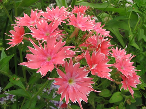 Другое название — пламенник. Родина — Техас. Многолетнее, травянистое, сильноветвящееся растение, культивируемое как однолетник, высотой 20—60 см, с прямостоячими стеблями и нижними сидячими, супротивными, верхними широколанцетными очередными листьями. Цветки гвоздиковидной формы собраны в сложные зонтиковидные соцветия на концах побегов. Окраска цветков самая разнообразная — от белой до фиолетовой, иногда двухцветная с глазком в центре. Особенно причудливую окраску имеет звездчатая форма. Известны садовые формы: компактная низкая и карликовая превосходная, высотой 20 см без глазка, чистых и нежных окрасок. Сорта флокса подразделяются по высоте на гигантские (40 см), высокие (30—35 см), низкие (20— 30 см) и карликовые (20 см). Цветет очень обильно все лето до заморозков. Цветение начинается через 45—60 дней после посева. Плод — двустворчатая коробочка. Семена серо-бурые или бурые, в 1 г 500—550 штук, всхожесть сохраняют 1—2 года. Флокс Друммонда — светолюбивое, теплолюбивое растение, но легко переносит заморозки, предпочитает богатые, хорошо дренированные почвы. Плохо растет при избытке и недостатке влаги. Размножают семенами. Выращивают в условиях Нечерноземной зоны рассадным способом (посев — в марте) и посевом в грунт в апреле—мае или под зиму. Рассаду высаживают в открытый грунт в июне, сохраняя расстояние 20—25 см между растениями. Цветение можно удлинить, если систематически удалять плоды. Для балконов, как и для альпийских горок, используют низкие и карликовые формы и сорта. Цветки в массе хорошо видны на далеком расстоянии и создают очень яркие однотонные и пестрые пятна. Если стебли пришпилить к земле, то получается яркий сплошной ковер. Поражается многими грибными и вирусными заболеваниями; повреждается паутинным клещом, совками и др.