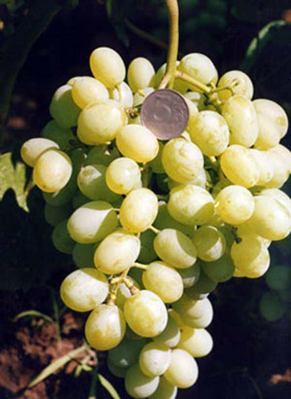 Восторг Идеальный. Идеальный — это любительское название гибридной формы, полученной в результате скрещивания СВК-12-375 х Восторг. Раннесреднего срока созревания (120- 125 дней). Корнесобственные насаждения сильнорослые. Грозди очень крупные, умеренно-плот- ные, средним весом около 1 кг. Нередко бывают грозди в 1,5 кг, а отдельные — более 2 кг. Форма гроздей коническая, часто с ответвлениями. Ягоды крупные, 5-6 г, овальные, иногда сосковидные, белые с плотной мясистой мякотью, приятного гармоничного вкуса. Сахаристость 18- 20%. Транспортабельность очень высокая. Побеги вызревают рано и очень хорошо, на всю длину прироста. Укореняемость черенков очень хорошая, корнесобственные насаждения вступают в плодоношение на второй, реже на третий год. Хорошо совместим с подвоями и другими сортами. Плодоносных побегов 80-95%, число гроздей на побег 1,5-2,5. Нагрузка кустов 35-45 глазков, обрезка на 6-8 глазков. Необходимо обязательное нормирование нагрузки кустов соцветиями и побегами, т. к. благодаря высочайшей плодоносности и очень крупным гроздьям ежегодно перегружается урожаем. Хорошо отзывчив на повышенные дозы удобрений, внекорневые и корневые подкормки. Плодоносность глазков у основания побегов очень высокая, поэтому можно обрезку проводить коротко, на 3-4 глазка. Предпочтительна длиннорукавная формировка, при которой дает урожай высоких товарных и вкусовых качеств. Морозостоек. Выдерживает мороз - 25°С, устойчив к милдью, серой гнили. Заслуживает самого широкого распространения на дачных участках благодаря своей высокой надежности и плодоносности.