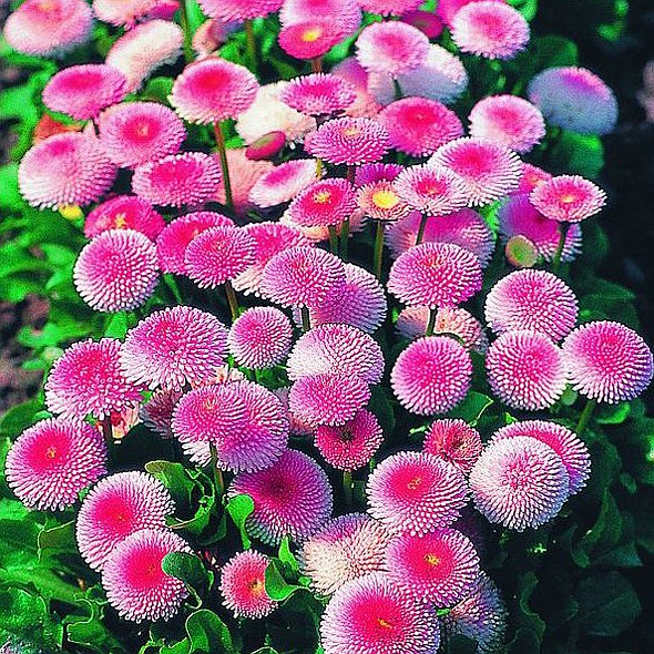 Родина – Северное полушарие (Западная Европа, Малая Азия, Закавказье). Многолетнее травянистое растение, культивируемое как двухлетник, высотой до 30 см, с розеткой черешчатых лопатчатых листьев, из которой вырастают цветоносы, заканчивающиеся соцветиями. Соцветие — корзинка розового, белого или карминно-красного цвета. Цветет в начале и конце лета, причем махровые сорта характеризуются более продолжительным цветением. Семянки плоские, мелкие, желтоватые, сохраняют всхожесть 3—4 года. В настоящее время известно большое количество сортов, объединенных в группы по диаметру, форме соцветий и срокам цветения. Ранние сорта относятся к группе простых, Свитхарт, лилипут, с многочисленными мелкими полумахровыми соцветиями, имеются группы, зацветающие позже (среднекрупные, Монстроза); позже всех цветут сорта из групп гигантеа и супер Энорма с гигантскими (до 6 см в диаметре) соцветиями. Один из лучших сортов — Этна. Растение морозоустойчивое, светолюбивое, но хорошо растет и в полутени. Предпочитает тяжелосуглинистые, плодородные с хорошим увлажнением почвы. Размножают семенами. При посеве в начале июля и одной пикировке растение уходят под зиму с хорошо сформированной розеткой листьев. В бесснежные морозные зимы растения могут подмерзать, необходимо укрытие торфом (слоем 5 см). Используют для балконного озеленения низкорослые, компактные сорта, которые длительно и обильно цветут. Растения весной высаживают в ящик, а после окончания цветения можно пересаживать в открытый грунт на доращивание на дачном участке. При недостаточном уходе маргаритка поражается мучнистой росой, ржавчиной и другими болезнями.