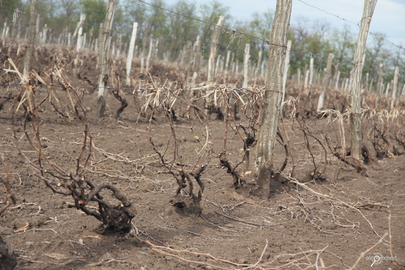 В апреле, как только в междурядьях просохнет почва, укрывные сорта винограда освобождают от зимнего укрытия. Важно весной не запаздывать с открытием виноградных кустов, так как при этом часть почек, распустившихся в темноте, может погибнуть не только от резкой перемены температуры, но и от резкого перехода от темноты к яркому свету. Тронувшиеся в рост почки повреждаются при весенних заморозках -2...3°С, а ткани распускающихся листьев и соцветия — даже при 0...-0,6°С. Распустившиеся весной почки и молодые побеги часто попадают под поздневесенние заморозки. Чтобы защитить виноградные растения, надо прежде всего сдерживать распускание почек на плодовых лозах. Для этого освобождают кусты из- под укрытия на несколько дней позже установленного для данной зоны срока, поднимают лозы пучком на первую проволоку шпалеры наклонно. Обильно опрыскивают их железным купоросом (100-150 г на ведро воды). Распускание почек в результате задерживается на 5-6 суток. Полезно и легкое притенение лоз хотя бы на 2-3 дня черной пленкой, матами, картонными щитками. Не допускают излишнего и несвоевременного (позднего) внесения азота. Можно при осенней обрезке оставить на каждой плодовой стрелке 2-3 коротких вызревших пасынка, обрезанных на 3-5 глазков. Весной эти почки прорастут раньше всех и задержат распускание остальных на основных побегах. После того как заморозки минуют, пасынки удаляют. Набухшие почки основных плодовых стрелок начинают получать достаточно питательных веществ, и вегетация протекает нормально, под заморозки они не попадают.