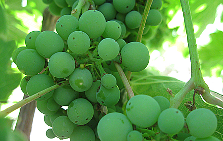 Сформировавшиеся ягоды быстро растут, оставаясь до начала созревания зелеными. Различная окраска ягод происходит от растворенных в клеточном соке пигментов. Клетки пигментов размещены в кожице ягод. Соцветия после оплодотворения цветков с началом роста ягод превращаются в грозди. Гроздь имеет ножку, гребни и ягоды. В разветвлениях грозди находятся проводящие ткани, происходит разрастание мягкого луба, что обеспечивает приток в ягоду в большом количестве питательных веществ. Продолжительность фазы роста ягод зависит от погодных условий и места посадки — открытый грунт, пристенная культура, южный или северный склон участка. Ягоды винограда бывают бессемянные в двух случаях. Во-первых, когда околоплодник цветка развивается без оплодотворения, то есть пыльца не попадает на рыльце пестика. Тогда вырастают мелкие круглые ягоды без семян, происходит торошение ягод. Это бывает у многих сортов, когда по каким-либо причинам не произошло опыление. Во-вторых, когда околоплодник развивается только после оплодотворения. В этом случае семена в ягоде бывают очень мелкие, пустые, при еде не чувствуются, а ягода вырастает до нормальных размеров, чаще овальной формы. Это кишмишные сорта — кишмиш черный, кишмиш белый, кишмиш розовый и другие. Семя в ягоде винограда мелкое, грушевидной формы и состоит из прочной кожуры, эндосперма, образованного из клеток, богатых питательными веществами (жира и белка), и зародыша.