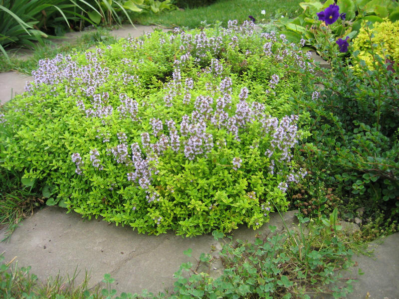Известен также как чабер обыкновенный, или богородская трава. Родина — европейская часть России (от Твери до Орла), Западная Сибирь, Скандинавия. Полукустарничек летне-, зимне-зеленый, высотой 4—10 см, с округлыми четырехгранными стелющимися стеблями. Листья мелкие (до 1 см), темнозеленые, матовые, супротивные, заостренно-эллиптические. Цветки мелкие, розово-фиолетовые, на концах веточек в ложных мутовках, собранных в головчатое соцветие. Цветет с середины июня. Растение морозоустойчивое, светолюбивое, растет на сухих песчаных почвах, нетребовательное. Размножают семенами и черенками, придаточные корни образуются в междоузлиях стебля, и растение быстро укореняется. Тимьян используется как почвопокровное (на альпийских горках) и пряно-ароматическое (на дачных участках) растение, можно выращивать на солнечных, теплых балконах в микросадиках. Болезни и вредители не выявлены.